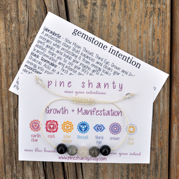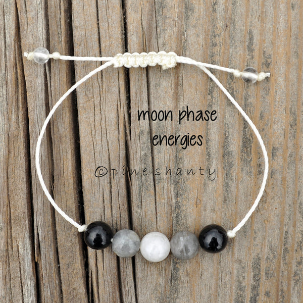 Moon Phase Energy adjustable meditation bracelet perfect for those working with the various moon phases for individual growth and manifestation especially for spiritual practices. Labradorite for the New Moon, Moonstone for the Full Moon and Black Tourmaline for the First and Third Quarter moons.